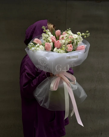 Букет "Dominique"из тюльпанов и маттиолы