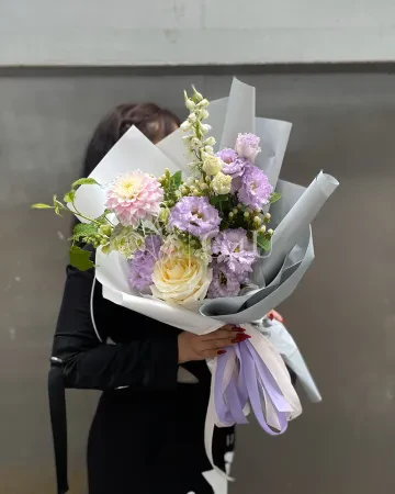 Букет "Молдир" из роз, георгинов и лизиантусов
