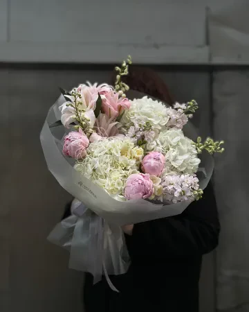 Композиция в кашпо "Vivien" из роз, пионовидных роз и тюльпанов