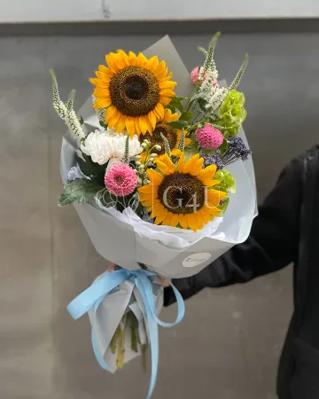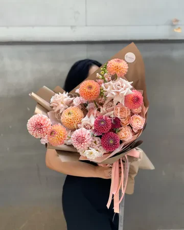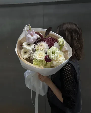 Букет "Алсу" из роз, георгинов и лизиантусов