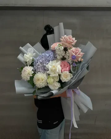 Букет "Безмятежность" из гортензии, роз и гвоздик