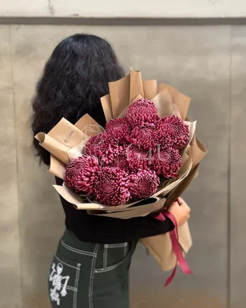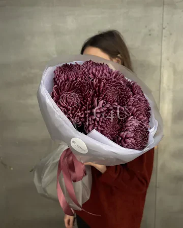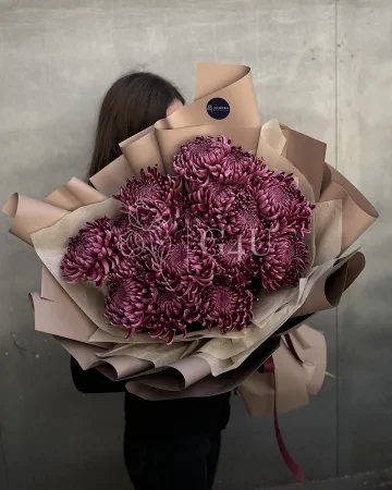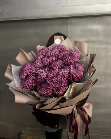 Букет из 21 бордовой хризантемы в коричневом оформлении