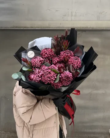 Моно букет "Софья" из 15 хризантем с эвкалиптом
