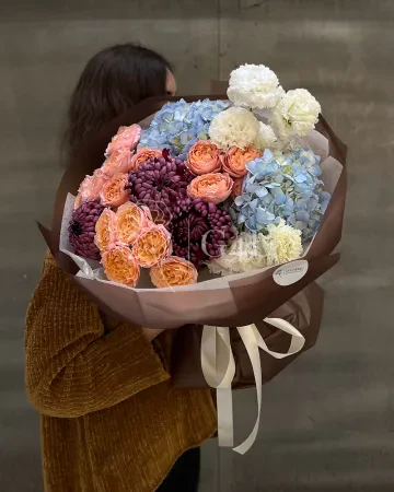 Букет "Зумрат" из спрей роз, гортензий и лизиантусов