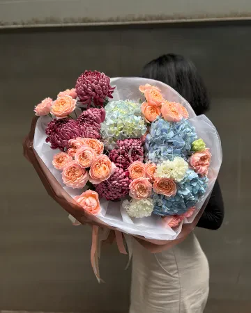 Композиция в кашпо "Charlotte" из роз, гортензий и хризантем