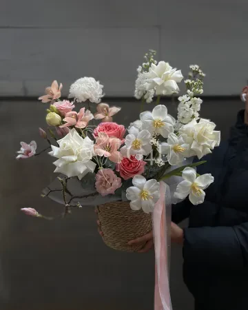 Композиция в кашпо "Vivien" из роз, пионовидных роз и тюльпанов