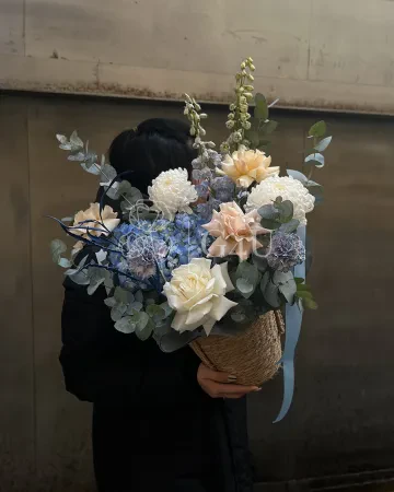 Композиция в кашпо "Весеннее настроение" из роз, гортензий и хризантем