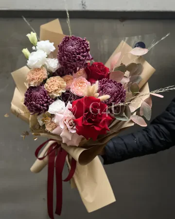 Букет "Айсулу" из хризантем и роз с сухоцветами