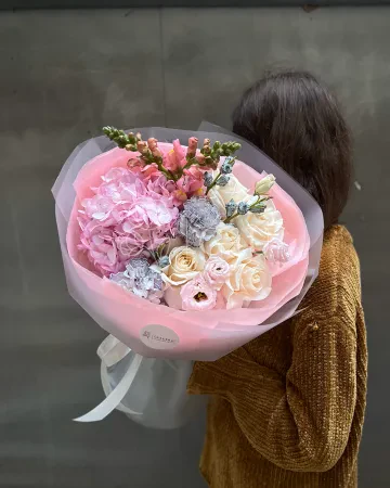 Букет "Замира" из гортензии, пионовидных роз и гвоздик