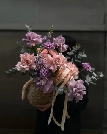 Букет в кашпо "Закат" из роз, гортензий и гвоздик