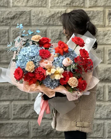 Букет "Замира" из гортензии, пионовидных роз и гвоздик