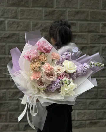 Букет "Nerina" из роз, гвоздик и лизиантусов