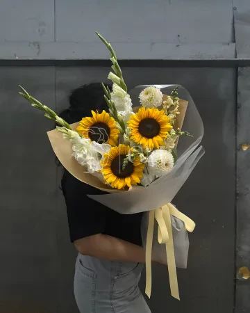 Букет "Марианна" из подсолнухов, роз и георгинов
