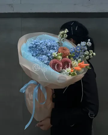 Букет "Матильда" из гортензии, георгинов и дельфиниума