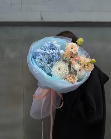 Букет "Мирцелла" из гортензии, георгинов и лизиантусов