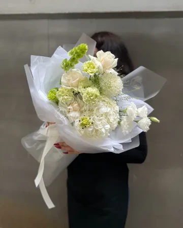 Букет "Айсауле" из георгинов, роз и лизиантусов