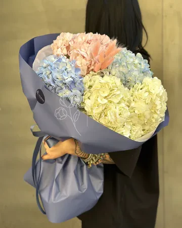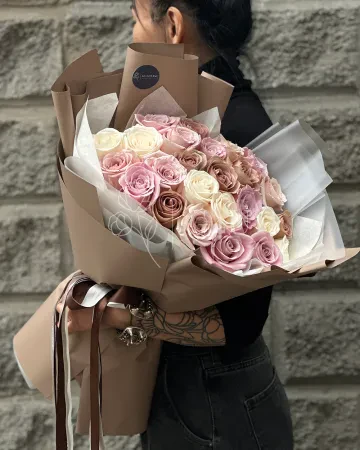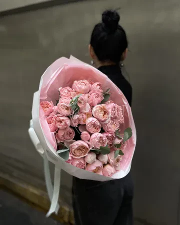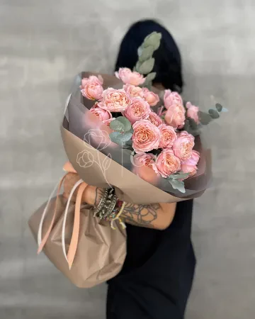 Букет из 21 бордовой хризантемы в коричневом оформлении