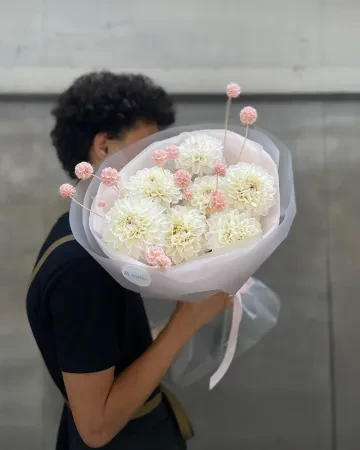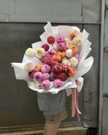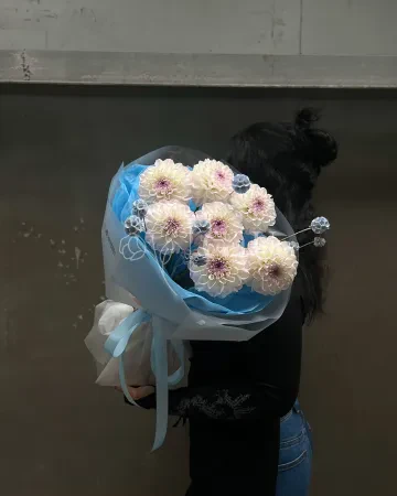 Моно букет из 7 георгинов в фиолетовом оформлении