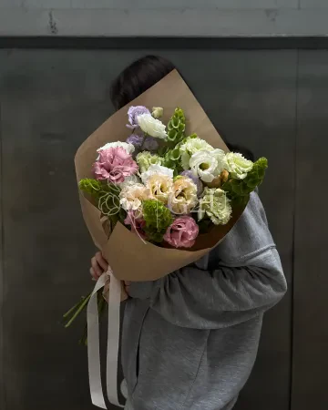 Моно букет "Дилинур" из лизиантусов и молюцеллы