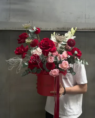 Композиция в коробке "Амани" из роз, пионовидных роз и гвоздик