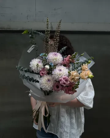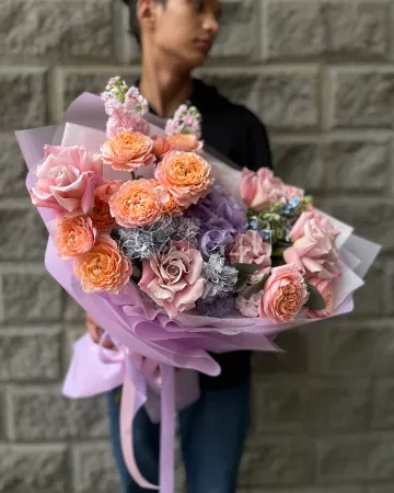 Букет "Мехрибан" из гвоздик, роз и эвкалипта