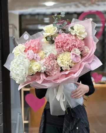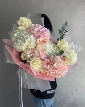 Букет "Дильдара" из роз, пионовидных роз и гортензий