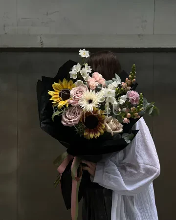 Букет "Clementina" из роз, подсолнухов и лизиантусов