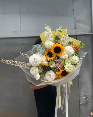 Букет "Фрейя" из подсолнухов, роз и георгинов