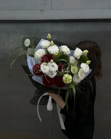 Букет "Улболсын" из георгинов, роз и лизиантусов