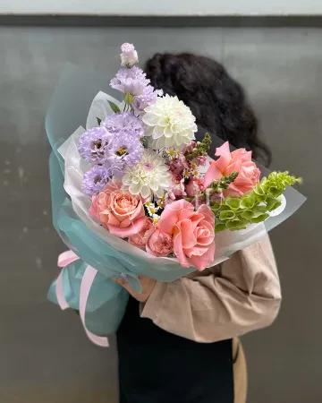 Букет "Айсауле" из георгинов, роз и лизиантусов