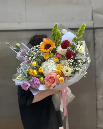 Букет "Валенсия" из подсолнухов, гортензий и лизиантусов
