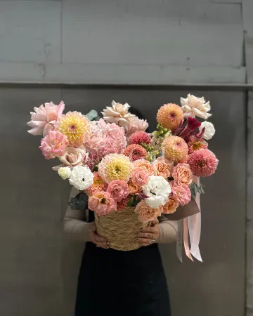Композиция в кашпо из роз, георгинов и лизиантусов
