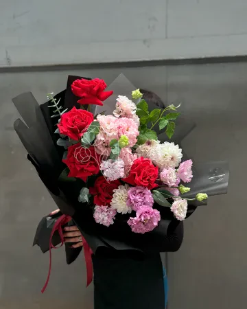 Букет "Наталья" из роз, георгинов и лизиантусов