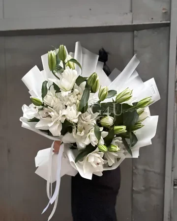Букет "Акбота" из роз, ромашек и лизиантусов