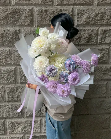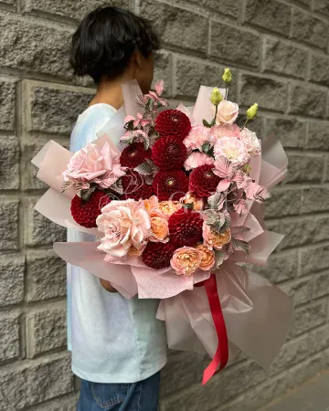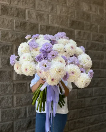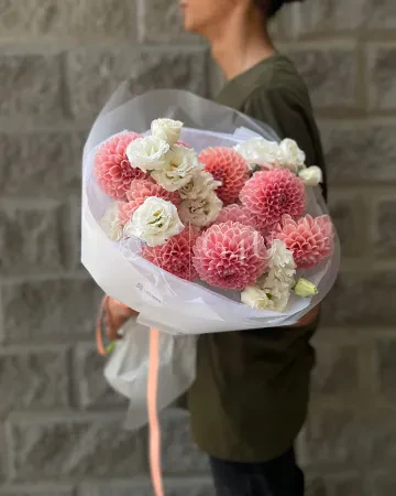 Букет "Summer Delight" из георгинов, пионовидных роз и лизиантусов