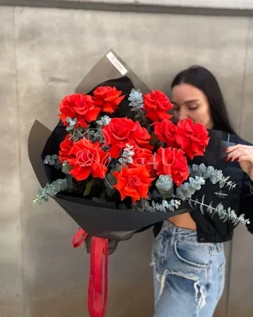 Букет “Ляззат” из 25 красных роз с эвкалиптом