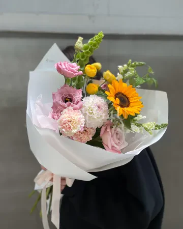 Букет "Василиса" из подсолнухов, лизиантусов и гвоздик