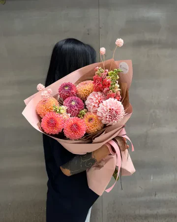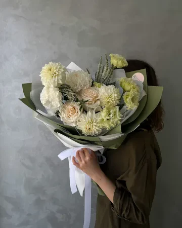 Букет "Азалия" из георгинов, роз и лизиантусов