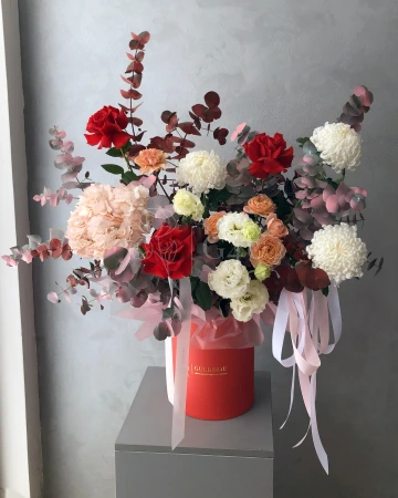 Композиция в коробке "Маули" из роз, хризантем и гортензии