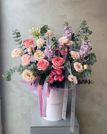 Композиция в коробке "Шолпан" из пионовидных роз и лизиантусов