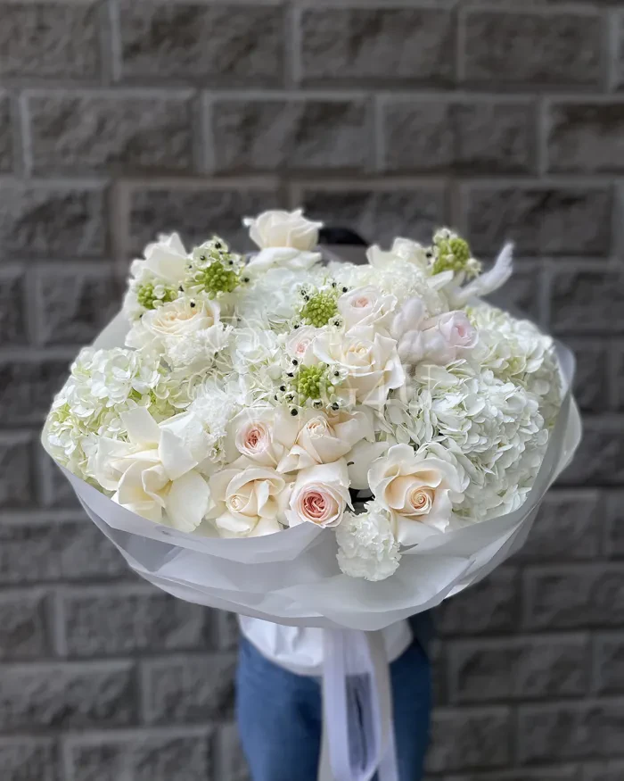 Шикарный нежный белый букет — это роскошная композиция, состоящая из изысканных и мягких оттенков белого цвета.