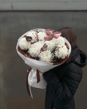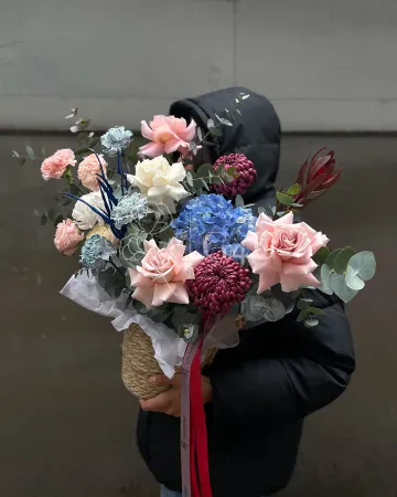 В его составе: благородные пудровые розы, нежные лизиантусы, пышные хризантемы и акценты из эвкалипта и левкоев. Цветовая гамма — в пастельных, приглушённых тонах: персиковый, молочный, пепельно-розовый и сиреневый. Композиция оформлена в элегантную белую коробку с лентой, что делает её идеальным подарком для утончённой натуры — как олицетворение нежности, грации и лёгкой аристократичности.