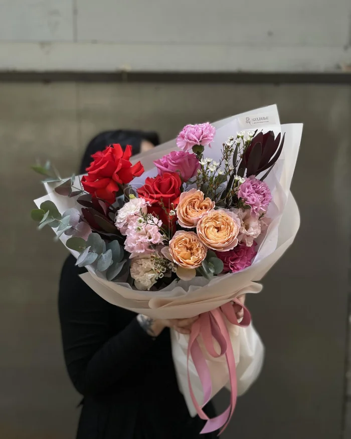 Букет выглядит утончённо и воздушно, создавая романтичное настроение и идеально подходя для особого повода или тёплого подарка.
