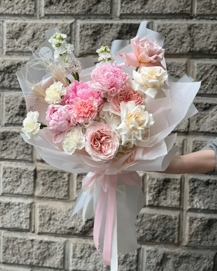 Главная Каталог Пионы Букет "Алиса"из роз, пионовидных роз и гвоздик