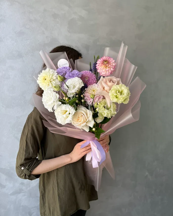 Букет "Кумыс" – это изысканная композиция, включающая нежные розы, яркие георгины и утончённые лизиантусы.