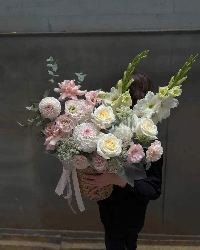 Розы привносят в букет классическую элегантность, георгины добавляют пышности и яркости, а лизиантусы подчеркивают нежность и утонченность. Такое сочетание создаёт гармоничный, выразительный букет, идеально подходящий для торжественных событий и особых моментов.