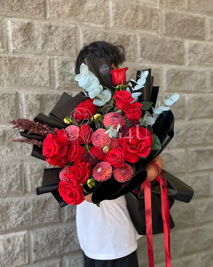 Букет "Азиза" — это утонченная композиция, сочетающая в себе изысканность георгинов и элегантность роз.