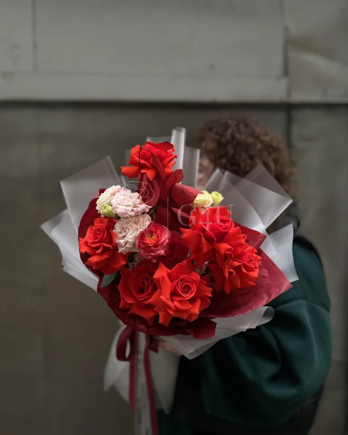 Гортензия создаёт мягкий объём, розы формируют классическую основу, а ранункулюсы добавляют изящный акцент и глубину. Крашеный эвкалипт завершает образ современным штрихом и подчёркивает характер композиции.