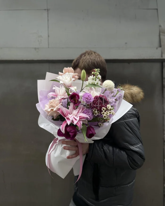 Тюльпаны придают букету динамику и свежесть, гвоздики добавляют мягкий объём, а розы и Момока создают нежные акценты и глубину оттенков. Лилия становится выразительной доминантой, маттиола наполняет букет тонким ароматом, хризантема усиливает пышность, а вакс добавляет изящную текстуру. Воздушный и яркий букет для радостного поздравления и лёгкого весеннего настроения 🦋🌸