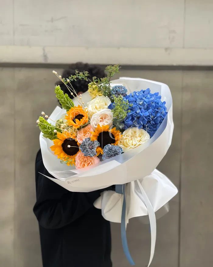 Цветовая гамма включает солнечные желтые, нежные голубые и розовые оттенки, создавая контрастную и живую композицию. Подсолнухи добавляют букету радость и энергию, гортензии придают объем и текстуру, а пионовидные розы добавляют изысканность и утонченность. Свежие и благоухающие цветы собраны в гармоничную и элегантную композицию, перевязанную декоративной лентой, создавая яркий и стильный образ.